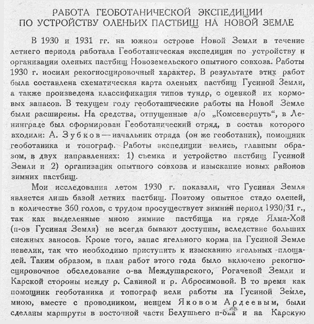 В 1930 и 1931 гг. на южном острове Новой Земли в течение летнего периода работала Геоботаническая экспедиция по устройству и организации оленьих пастбищ Новоземельского опытного совхоза. Работы 1930 г. носили рекогносцировочный характер. В результате этих работ была составлена схематическая карта оленьих пастбищ Гусиной Земли, а также произведена классификация типов тундр, с оценкой их кормовых запасов. В текущем году геоботанические работы на Новой Земле были расширены. На средства, отпущенные а/о „Комсеверпуть", в Ленинграде был сформирован Геоботанический отряд, в состав которого входили: А. Зубков — начальник отряда (он же геоботаник), помощник геоботаника и топограф. Работы экспедиции велись, главным образом, в двух направлениях: 1) съемка и устройство пастбищ Гусиной Земли и 2) организация опытного совхоза и изыскание новых районов зимних пастбищ.