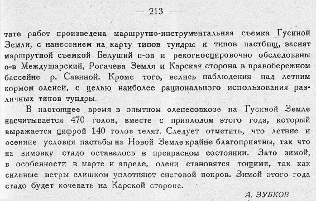 В настоящее время в опытном оленесовхозе на Гусиной Земле насчитывается 470 голов, вместе с приплодом этого года, который выражается цифрой 140 голов телят. Следует отметить, что летние и осенние условия пастьбы на Новой Земле крайне благоприятны, так что на зимовку стадо оставалось в прекрасном состоянии. Зато зимой, в особенности в марте и апреле, олени становятся тощими, так как сильные ветры слишком уплотняют снеговой покров. Зимой этого года стадо будет кочевать на Карской стороне.