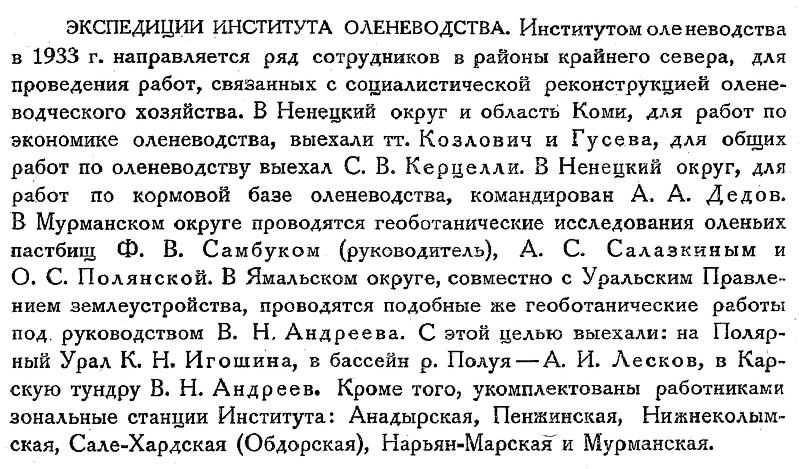 ЭКСПЕДИЦИИ ИНСТИТУТА ОЛЕНЕВОДСТВА. Институтом оленеводства в 1933 г. направляется ряд сотрудников в районы крайнего севера, для проведения работ, связанных с социалистической реконструкцией оленеводческого хозяйства. В Ненецкий округ и область Коми, для работ по экономике оленеводства, выехали тт. Козлович и Гусева, для общих работ по оленеводству выехал С. В. Керцелли. В Ненецкий округ, для работ по кормовой базе оленеводства, командирован А. А. Дедов. В Мурманском округе проводятся геоботанические исследования оленьих пастбищ Ф. В. Самбуком (руководитель), А. С. Салазкиным и О. С. Полянской. В Ямальском округе, совместно с Уральским Правлением землеустройства, проводятся подобные же геоботанические работы под. руководством В. Н. Андреева. С этой целью выехали: на Полярный Урал К. Н. Игошина, в бассейн р. Полуя — А. И. Лесков, в Карскую тундру В. Н. Андреев. Кроме того, укомплектованы работниками зональные станции Института: Анадырская, Пенжинская, Нижнеколымская, Сале-Хардская (Обдорская), Нарьян-Марская и Мурманская.