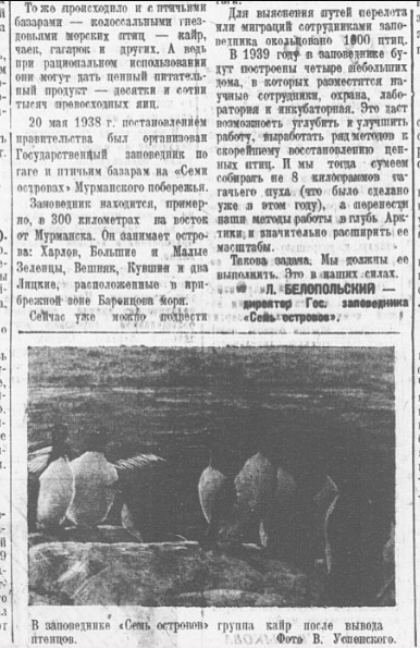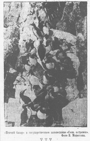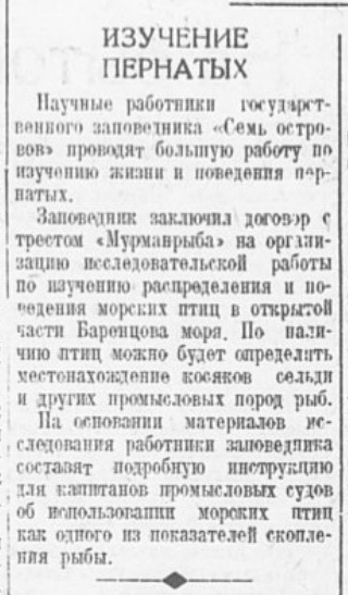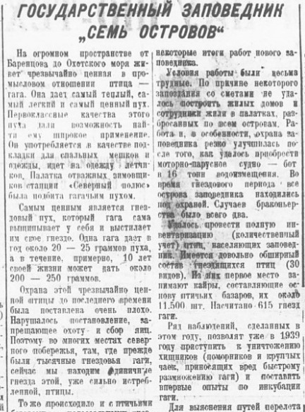 Известия, 1947, № 68 (9290), 21 марта.Заповедный район на Новой ЗемлеАРХАНГЕЛЬСК, 20 марта. (По телеф. от соб. корр.). Территория заполярного государственного заповедника «Семь островов» увеличивается с 800 до 7.800 гектаров за счет включения полосы Мурманского побережья и большого участка западного берега Новой Земли.