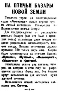 Экспедиции указан ряд птичьих базаров, на которых в этом году не разрешается крупная сборка яиц. Эти базары будут использованы для местных нужд жителей островов.