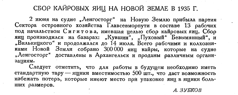2 июня на судне „Ленгосторг" на Новую Землю прибыла партия Сектора островного хозяйства Главсевморпути в составе 13 рабочих под начальством Сигитова, имевшая целью сбор кайровых яиц. Сбор яиц производился на базарах: „Кувшин", „Пуховый" Безымянный", и „Вилькицкого" и продолжался до 14 июля. Всего рабочими и колхозниками Новой Земли собрано 300 000 яиц кайры, которые на судне „Ленгосторг" доставлены в Архангельск и проданы различным организациям.