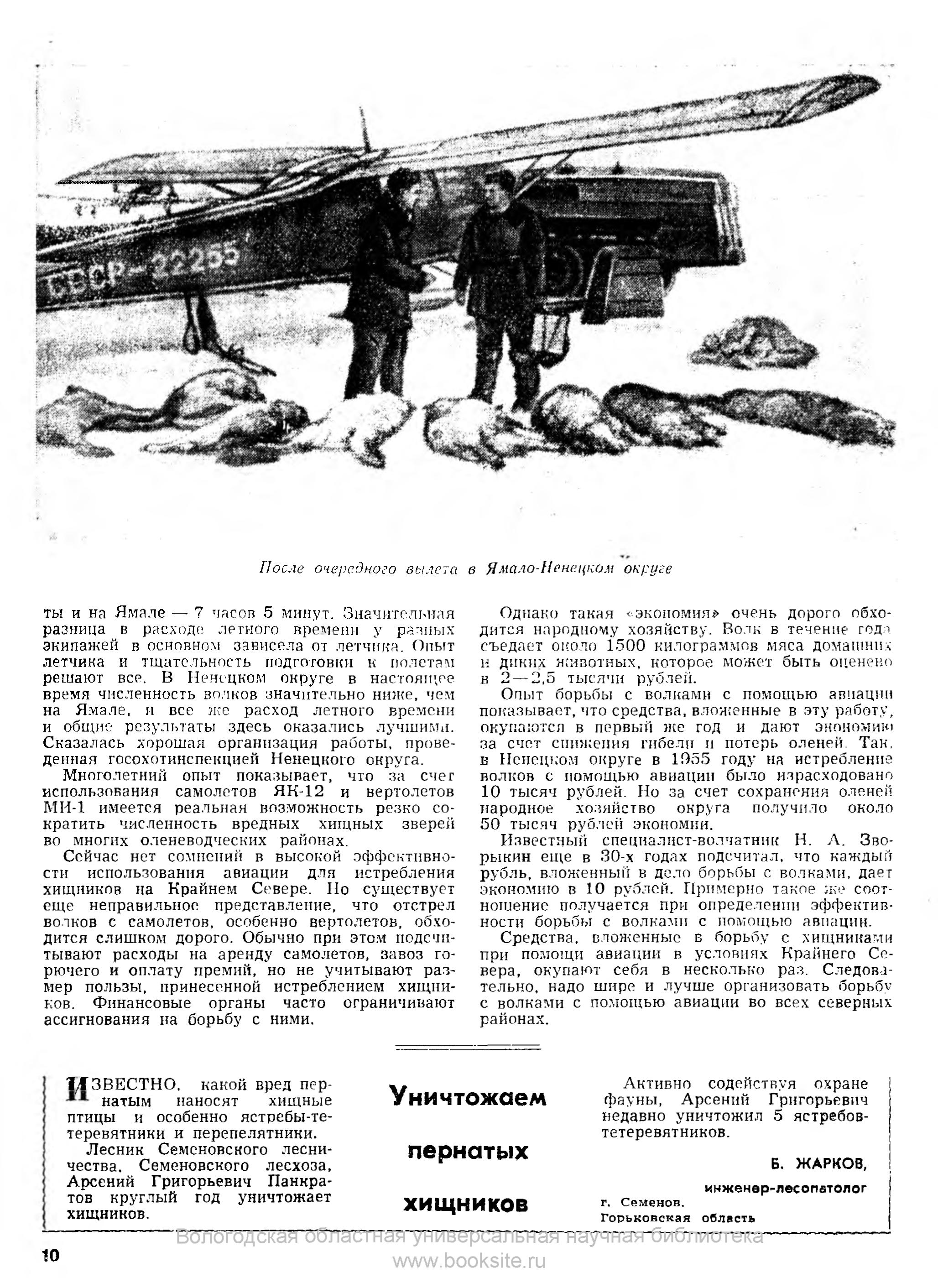 Многолетний опыт показывает, что за счет использования самолетов ЯК-12 и вертолетов МИ-1 имеется реальная возможность резко сократить численность вредных хищных зверей во многих оленеводческих районах.