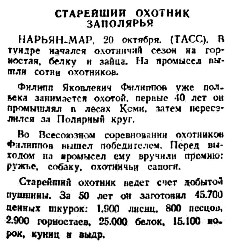 Во Всесоюзном соревновании охотников Филиппов вышел победителем. Перед выходом на промысел ему вручили премию: ружье, собаку, охотничьи сапоги.