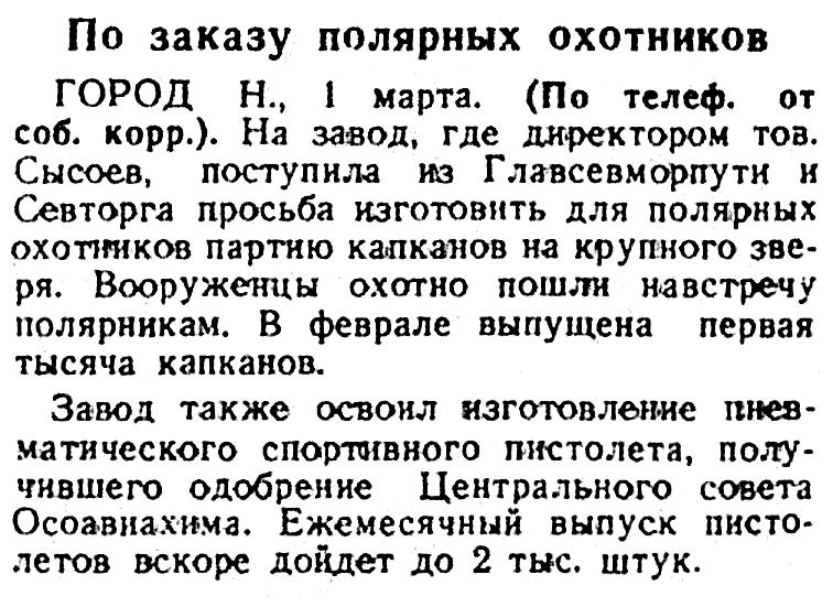 Завод также освоил изготовление пневматического спортивного пистолета, получившего одобрение Центрального совета Осоавиахима. Ежемесячный выпуск пистолетов вскоре дойдет до 2 тыс. штук.