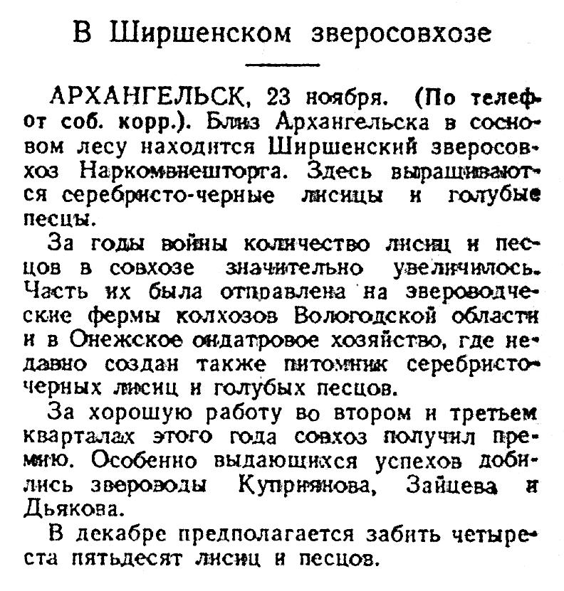 За годы войны количество лисиц и песцов в совхозе значительно увеличилось. Часть их была отправлена на звероводческие фермы колхозов Вологодской области и в Онежское ондатровое хозяйство, где недавно создан также питомник серебристо-черных лисиц и голубых песцов.