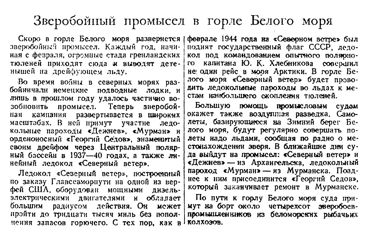 Во время войны в северных морях разбойничали немецкие подводные лодки, и лишь в прошлом году удалось частично возобновить промысел. Теперь зверобойная кампания развертывается в широких масштабах. В ней примут участие ледокольные пароходы «Дежнев», «Мурман» и орденоносный «Георгий Седов», знаменитый своим дрейфом через Центральный полярный бассейн в 1937—40 годах, а также линейный ледокол «Северный ветер».