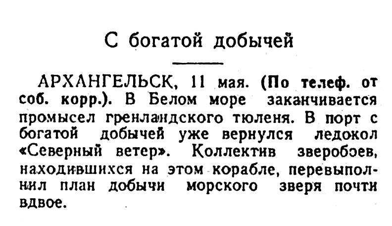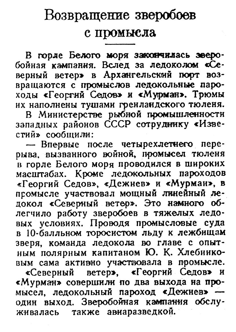 — Впервые после четырехлетнего перерыва вызванного войной, промысел тюленя в горле Белого моря проводился в широких масштабах. Кроме ледокольных пароходов «Георгий Седов», «Дежнев» и «Мурман», в промысле участвовал мощный линейный ледокол «Северный ветер». Это намного облегчило работу зверобоев в тяжелых ледовых условиях. Проводя промысловые суда в 10-балльном торосистом льду к лежбищам зверя, команда ледокола во главе с опытным полярным капитаном Ю. К. Хлебниковым сама активно участвовала в промысле.