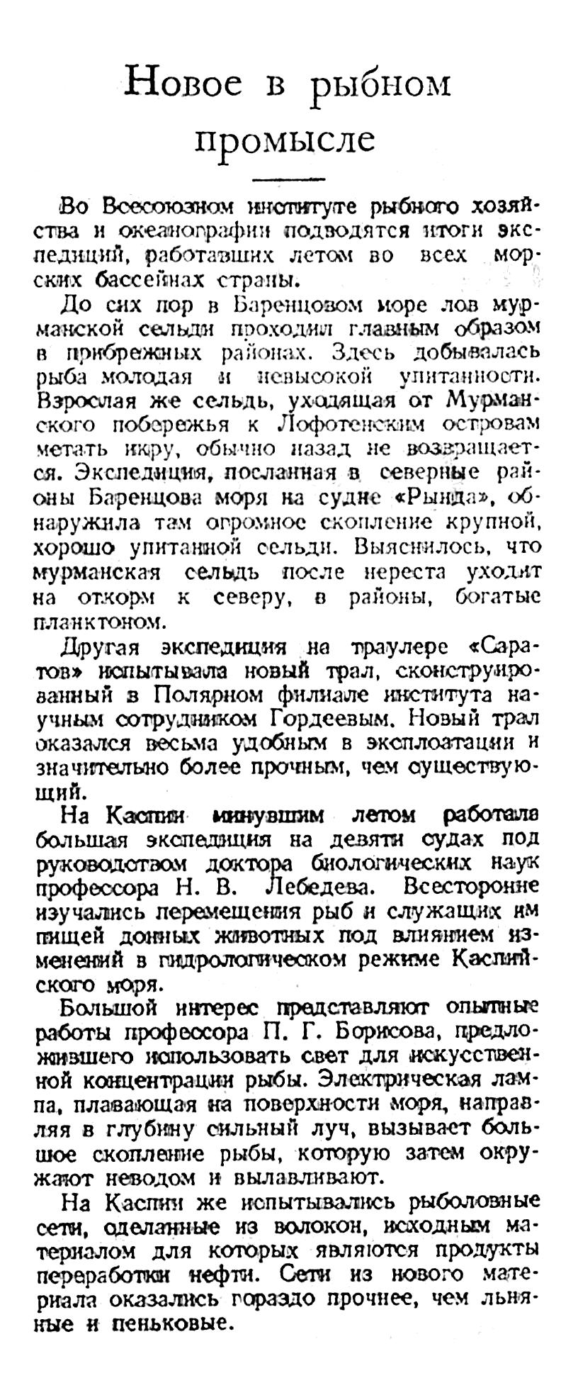 На Каспии минувшим летом работала большая экспедиция на девяти судах под руководствам доктора биологических наук профессора Н. В. Лебедева. Всесторонне изучались перемещения рыб и служащих им пищей донных животных под влиянием изменений в гидрологическом режиме Каспийского моря.