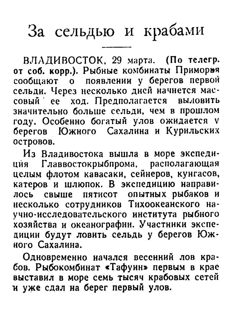 Из Владивостока вышла в море экспедиция Главвостокрыбпрома, располагающая целым флотом кавасаки, сейнеров, кунгасов, катеров и шлюпок. В экспедицию направилось свыше пятисот опытных рыбаков и несколько сотрудников Тихоокеанского научно-исследовательского института рыбного хозяйства и океанографии. Участники экспедиции будут ловить сельдь у берегов Южного Сахалина.
