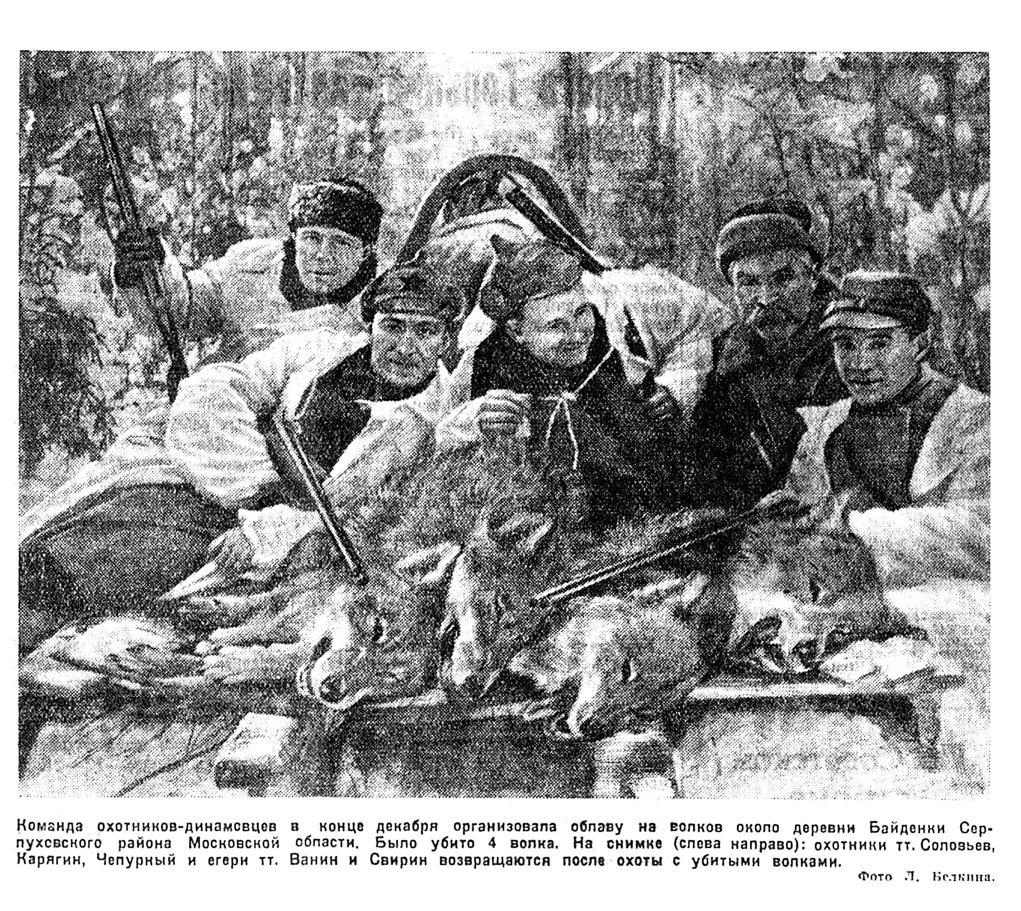 Команда охотников-динамовцев в конце декабря организовала облаву на волков около деревни Байденки Серпуховского района Московской области. Было убито 4 волка. На снимке (слева направо): охотники тт. Соловьев, Карягин, Чепурный и егери тт. Ванин и Свирин возвращаются после охоты с убитыми волками.