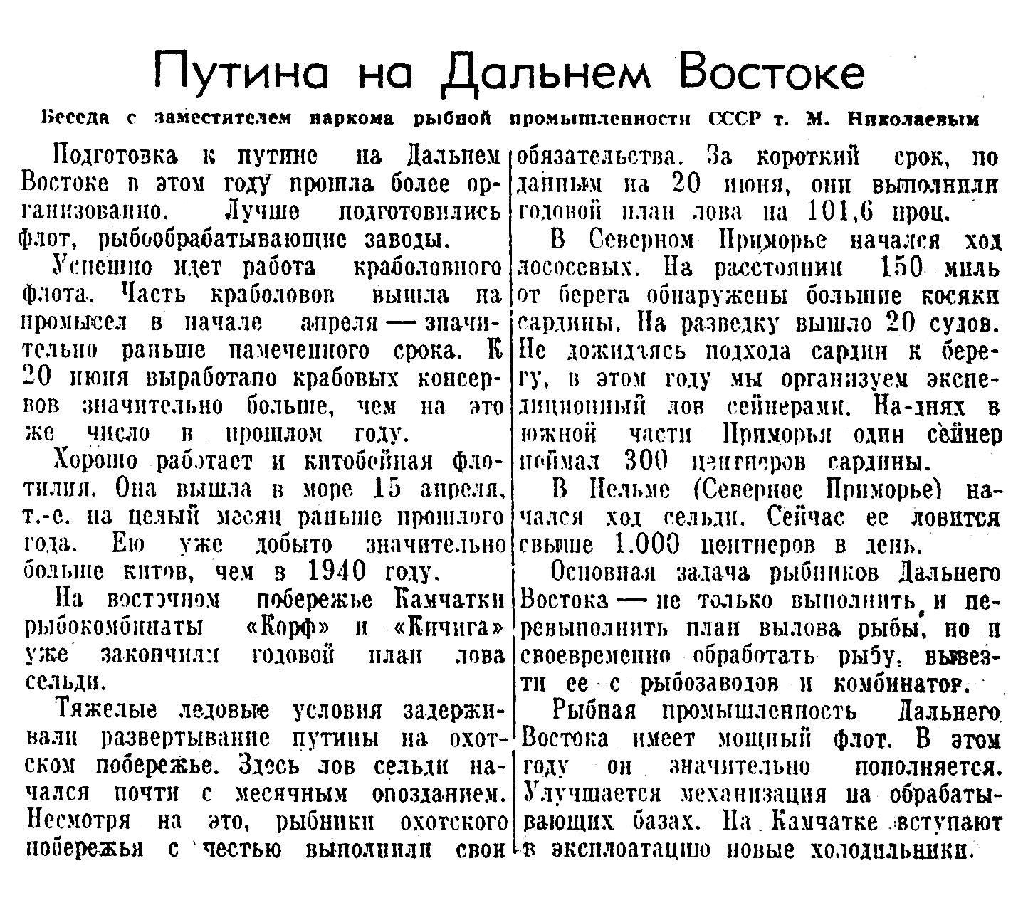 Тяжелые ледовые условия задерживали развертывание путины на охотском побережье. Здесь лов сельди начался почти с месячным опозданием. Несмотря на это, рыбники охотского побережья с честью выполнили свои обязательства. За короткий срок, по данным на 20 нюня, они выполнили годовой план лова на 101,0 проц.