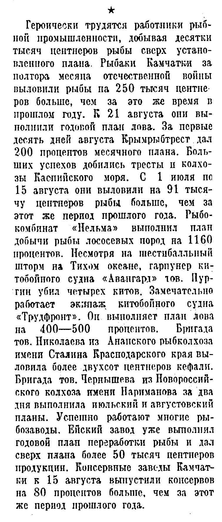• Героически трудятся работники рыбной промышленности, добывая десятки тысяч центнеров рыбы сверх установленного плана. Рыбаки Камчатки за полтора месяца отечественной войны выловили рыбы на 250 тысяч центнеров больше, чем за это же время в прошлом году. К 21 августа они выполнили годовой план лова. За первые десять дней августа Крымрыбтрест дал 200 процентов месячного плана. Больших успехов добились тресты и колхозы Каспийского моря. С 1 июля по 15 августа они выловили на 91 тысячу центнеров рыбы больше, чем за этот же период прошлого года. Рыбокомбинат «Нельма» выполнил план добычи рыбы лососевых пород на 1160 процентов. Несмотря на шестибалльный шторм на Тихом океане, гарпунер китобойного судна «Авангард» тов. Пургин убил четырех китов. Замечательно работает экипаж китобойного судна «Трудфронт». Он выполняет план лова на 400—500 процентов. Бригада тов. Николаева из Анапского рыбколхоза имени Сталина Краснодарского края выловила более двухсот центнеров кефали. Бригада тов. Чернышева из Новороссийского колхоза имени Нариманова за два дня выполнила июльский и августовский планы. Успешно работают многие рыбозаводы. Ейский завод уже выполнил годовой план переработки рыбы и дал сверх плана более 50 тысяч центнеров продукции. Консервные заводы Камчатки к 15 августа выпустили консервов на 80 процентов больше, чем за этот же период прошлого года.