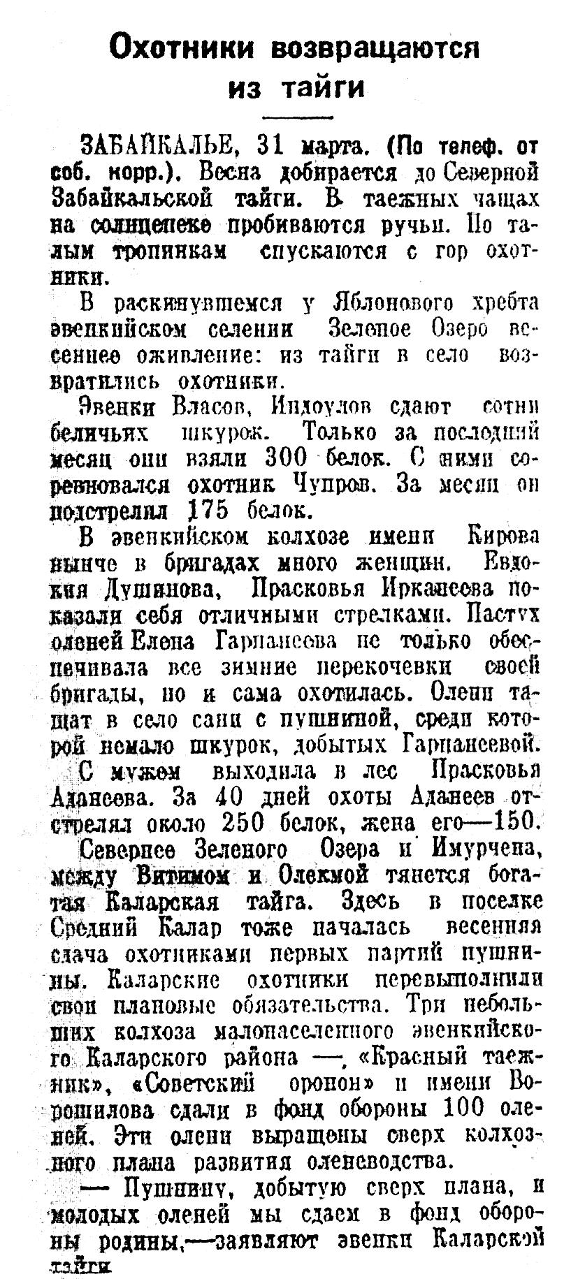 В эвенкийском колхозе имени Кирова нынче в бригадах много женщин. Евдокия Душинова, Прасковья Ирканеева показали себя отличными стрелками. Пастух оленей Елена Гарпанеева не только обеспечивала все зимние перекочевки своей бригады, но и сама охотилась. Олени тащат в село сани с пушниной, среди которой немало шкурок, добытых Гарпанеевой.