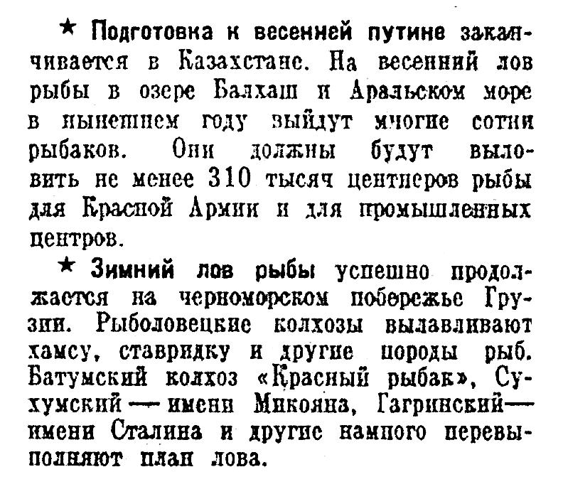 • Зимний лов рыбы успешно продолжается на черноморском побережье Грузии. Рыболовецкие колхозы вылавливают хамсу, ставридку и другие породы рыб. Батумский колхоз «Красный рыбак». Сухумский имени Микояна, Гагринский — имени Сталина и другие намного перевыполняют план лова.