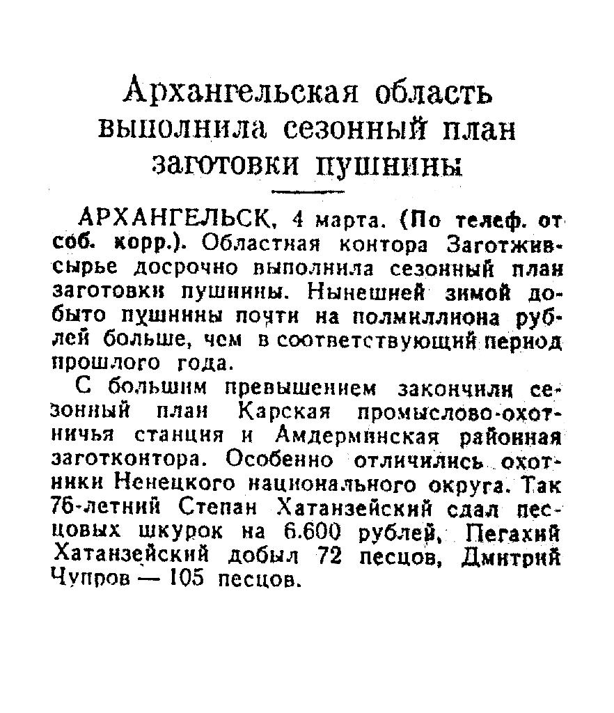 С первых дней среди возчиков развернулась борьба за быстрейшую доставку и полную сохранность грузов н оленей, занятых на перевозках. Первенство взял старый и опытный проводник-эвенк Татакан, в бригаде у которого 30 пар оленей. Но вскоре его обогнала в соревновании бригада эвенкийских девушек Маруси Михайловой. Выйдя впервые в самостоятельный рейс, 15 — 16-летние девушки-колхозницы за три дня прошли по тайге путь в 100 с лишним километров и доставили на 25 нартах 180 пудов груза.