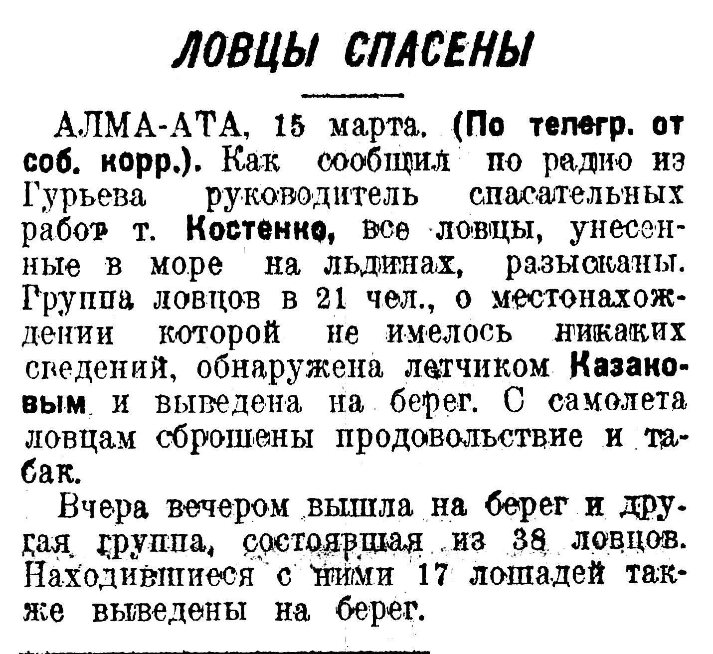 Итоги таковы: все ловцы и лошади, унесенные на льдине в море, выведены. Имеются потери сетей. Отмечаю активную работу летчика Казакова и бортмеханика Шоршина и ходатайствую перед правительством Казакстана о награждении их.