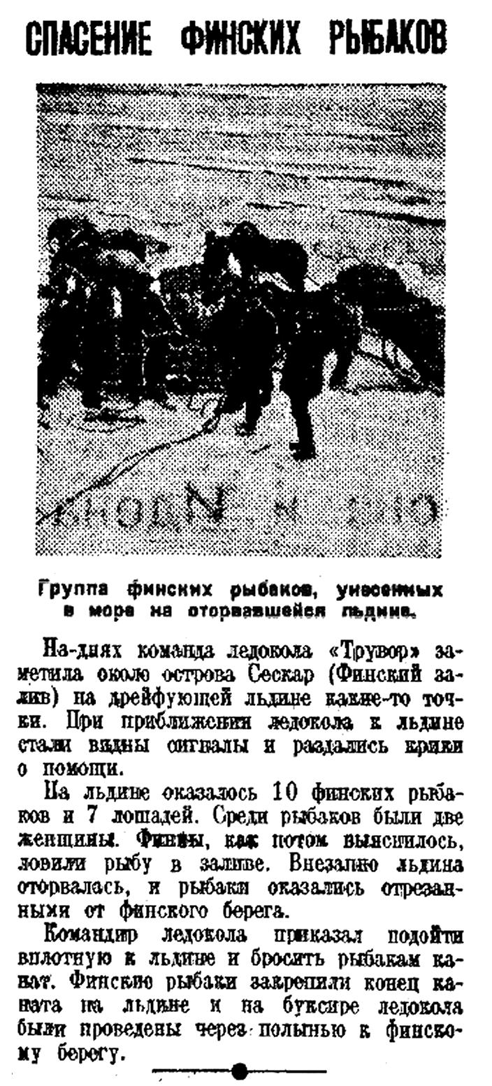 На льдине оказалось 10 финских рыбаков и 7 лошадей. Среди рыбаков были две женщины. Финны, как потом выяснилось, ловили рыбу в заливе. Внезапно льдина оторвалась, и рыбаки оказались отрезанными от финского берега.