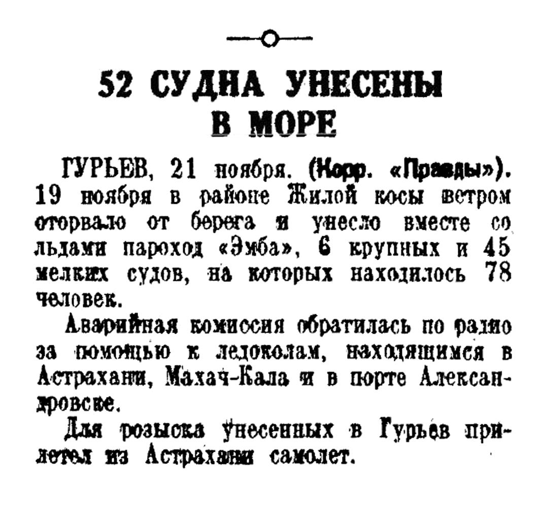 ГУРЬЕВ, 21 ноября. (Корр. «Правды»). 19 ноября в районе Жилой косы ветром оторвало от берега и унесло вместе со льдами пароход «Эмба», 6 крупных и 45 мелках судов, на которых находилось 78 человек.