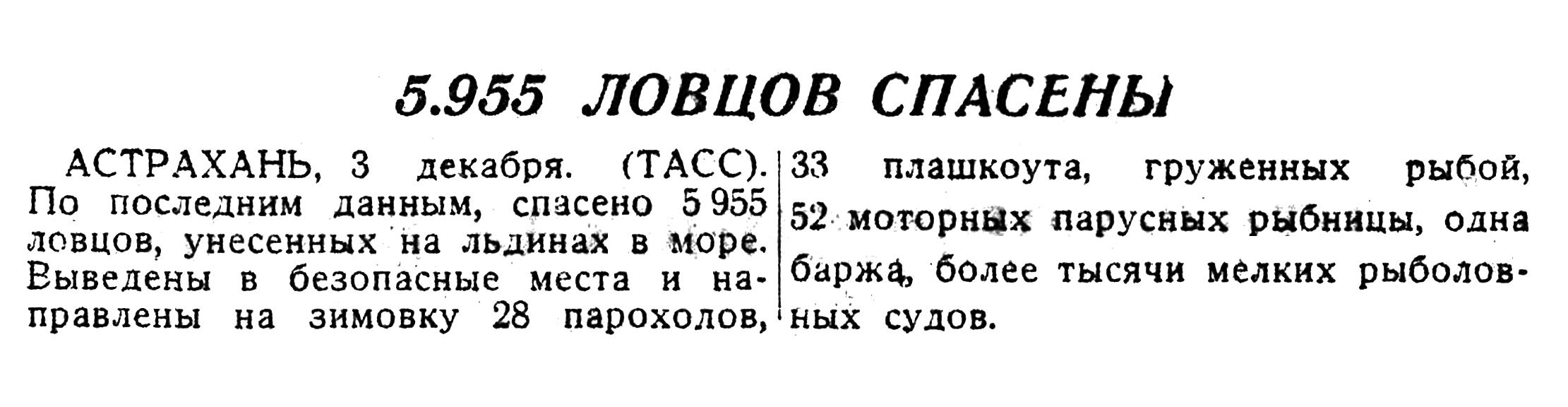 АСТРАХАНЬ, 3 декабря. (ТАСС). По последним данным, спасено 5 955 ловцов, унесенных на льдинах в море. Выведены в безопасные места и направлены на зимовку 28 пароходов, 33 плашкоута, груженных рыбой, 52 моторных парусных рыбницы, одна баржа, более тысячи мелких рыболовных судов.