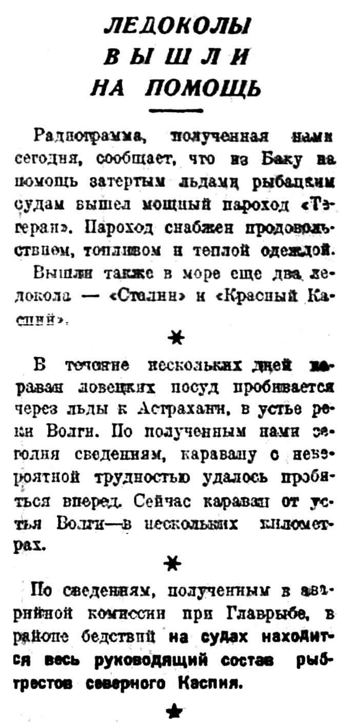 Радиограмма, полученная нами сегодня, сообщает, что из Баку на помощь затертым льдам и рыбацким судам вышел мощный пароход «Тегеран». Пароход снабжен продовольствием, топливом и теплой одеждой.