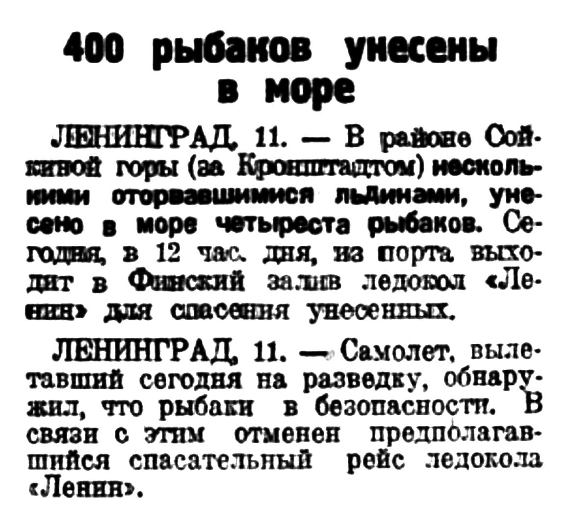 ЛЕНИНГРАД, 11. — В районе Сойкиной горы (за Кронштадтом) несколькими оторвавшимися льдинами, унесено в море четыреста рыбаков. Сегодня, в 12 час. дня, из порта выходит в Финский залив ледокол «Ленин» для спасения унесенных.