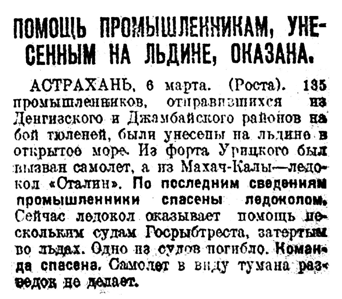 АСТРАХАНЬ, 6 марта. (Роста). 135 промышленников, отправившихся из Денгизского и Джамбайского районов на бой тюленей, были унесены на льдине в открытое море. Из форта Урицкого был вызван самолет, а из Махач-Калы — ледокол «Сталин». По последним сведениям промышленники спасены ледоколом. Сейчас ледокол оказывает помощь нескольким судам Госрыбтреста, затертым во льдах. Одно из судов погибло. Команда спасена. Самолет в виду тумана разведок не делает.