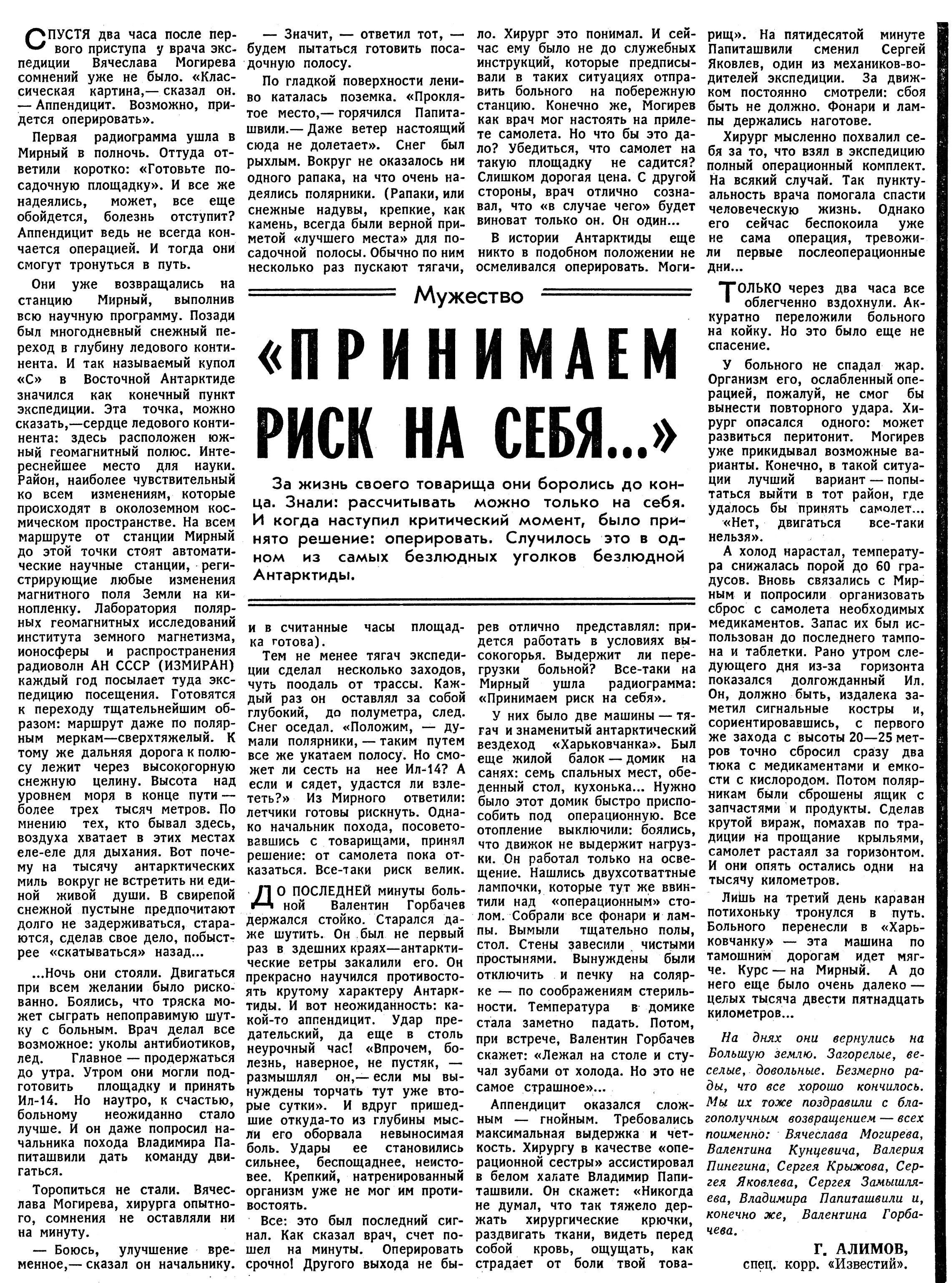 «ПРИНИМАЕМ РИСК НА СЕБЯ... »За жизнь своего товарища они боролись до конца. Знали: рассчитывать можно только на себя. И когда наступил критический момент, было принято решение: оперировать. Случилось это в одном из самых безлюдных уголков безлюдной Антарктиды.