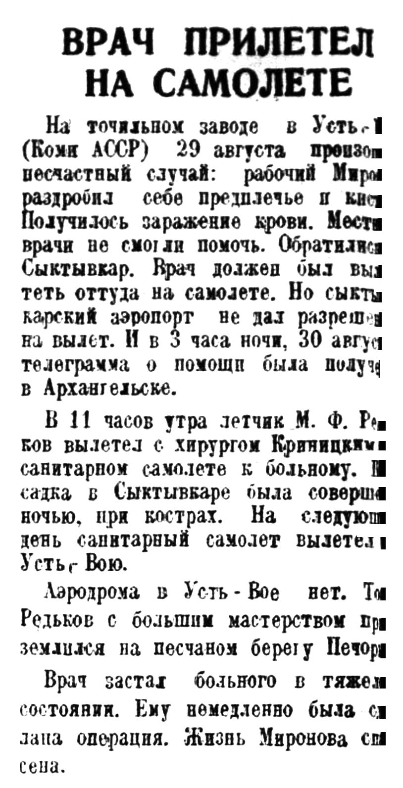 13 февраля 1929 г. самолет "Ю-13" под управлением летчика И. В. Михеева, нынешнего командира "АНТ-14" вылетел из Москвы и на другой день был в Пудоже. 15 февраля Громцева лежала на операционном столе в одной из клиник Ленинграда. Ее жизнь была спасена. Спасена самолетом.