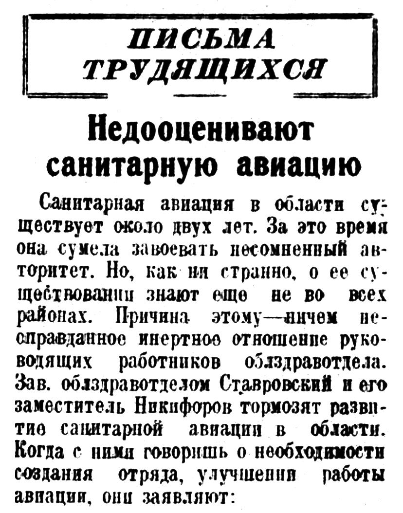 Гражданской санитарной авиации у нас не было до последнего времени. А между тем она может и должна оказать нам неоценимые услуги. Стоит лишь представить себе огромные пространства Союза и ощутимый пока еще недостаток медицинских учреждений (в пунктах, удаленных от культурных центров, чтобы огромная роль и колоссальные перспективы развития санитарной авиации в СССР стали очевидны каждому.