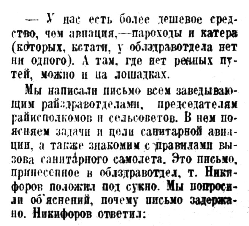 Было бы однако ошибкой думать, что уже тогда мы имели свою санитарную гражданскую авиацию. В приведенных примерах речь идет об обычных самолетах, случайно примененных в новой для них области.