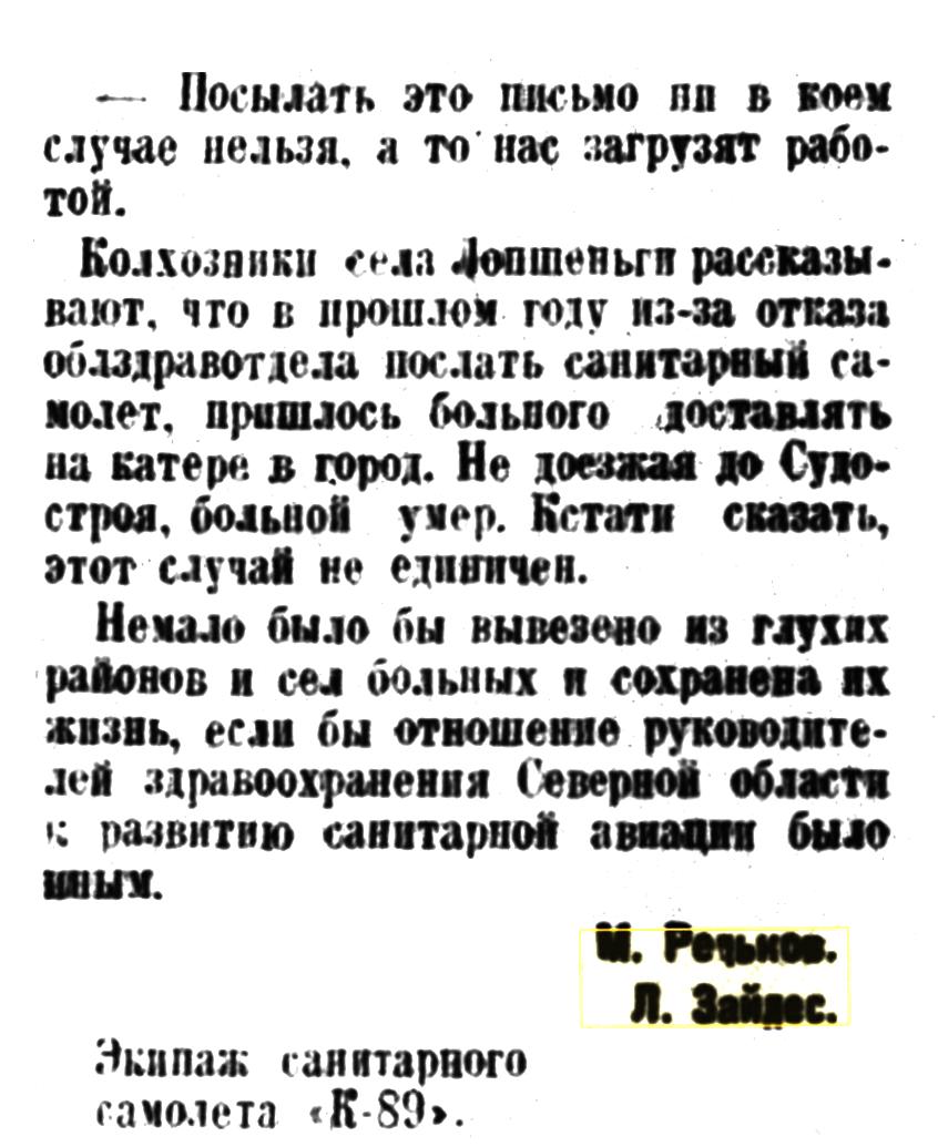 С. П. Осипов уже готовил самолет к первому агитрейсу. В этой работе С. П. Осипову помогал энтузиаст санитарной авиации тов.