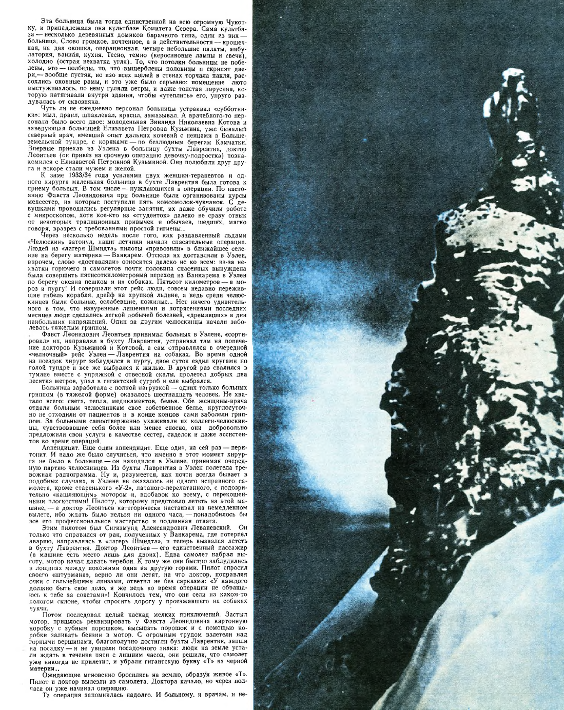 Чуть ли не ежедневно персонал больницы устраивал «субботники». мыл, драил, шпаклевал, красил, замазывал. А врачебного-то персонала было всего двое: молоденькая Зинаида Николаевна Котова и заведующая больницей Елизавета Петровна Кузьмина, уже бывалый северный врач, имевший опыт дальних кочевий с ненцами в Большеземельской тундре, с коряками — по безлюдным берегам Камчатки. Впервые приехав из Уэлена в больницу бухты Лаврентия, доктор Леонтьев (он привез на срочную операцию девочку-подростка) познакомился с Елизаветой Петровной Кузьминой. Они полюбили друг друга и вскоре стали мужем и женой.