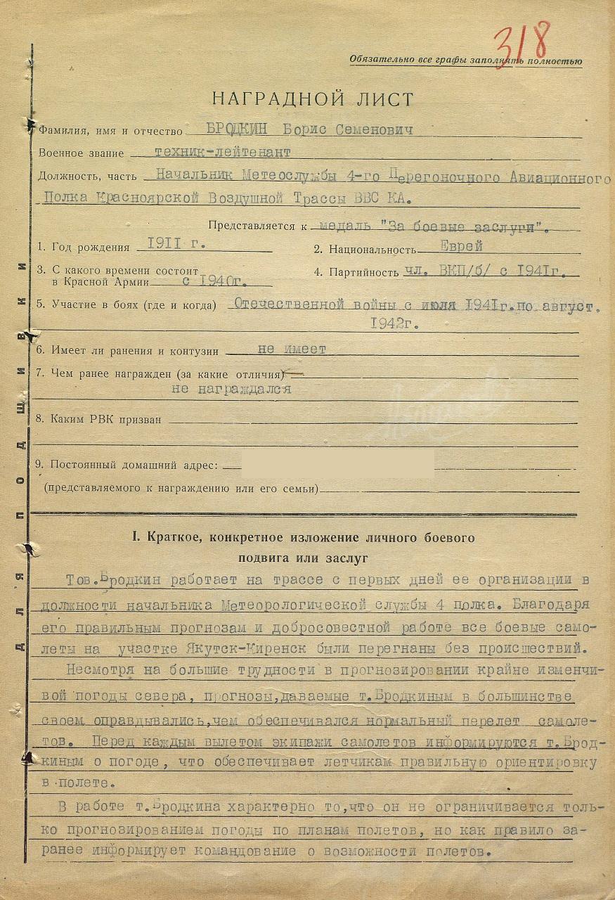 Борис Бродкин по возрасту был в экипаже старшим, ему уже подкатывало к пятидесяти. Но в авиацию он пришел позже других, перепробовав перед тем не одну профессию. Закончив фабрично-заводскую школу, работал на ростовской обувной фабрике, увлекался туризмом и альпинизмом, поднимался зимой на Эльбрус, где обморозился, в результате чего потерял фаланги пальцев на руках. Стал штатным инструктором по туризму, водил группы по кавказским ущельям, а переехав в Москву, поступил на службу в ОПТЭ (Общество пролетарского туризма и экскурсий). В 1937 году это Общество перестало существовать, и Бродкин, окончив курсы полярных работников, выучился на метеоролога.