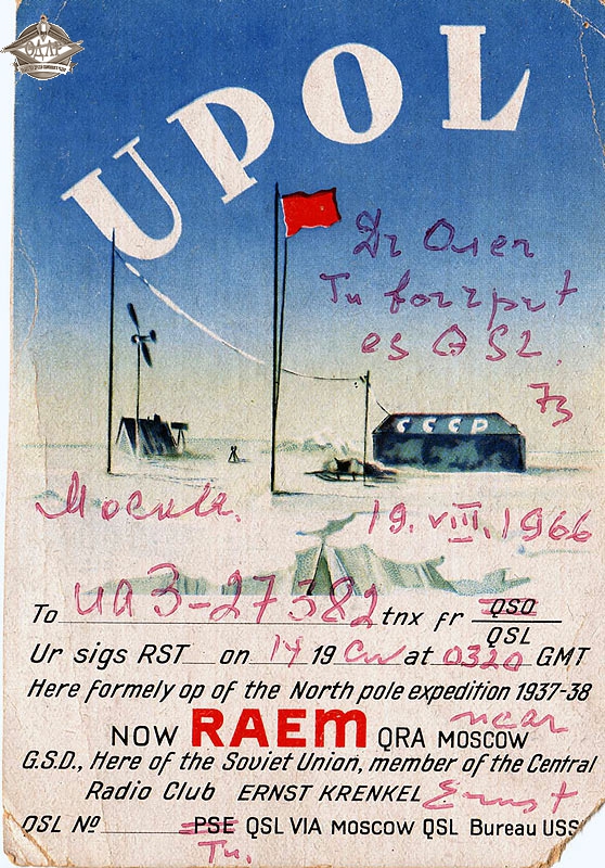 :": Благодаря Участнику Форумов Алексею Дмитриевичу, у нас появилась возможность увидеть во всех деталях еще одну раритетную QSL-карточку Э.Т.Кренкеля, образца 1960 года, отпечатанную в Москве, в типографии ГЭИ на Шлюзовой набережной. Карточка во многом напоминает ту, что продавалась на Молотке, но оборот её более динамичен и живописен: на нём оттиснута лаконичная гравюра, выполненная профессиональным книжным графиком и изображающая момент гибели легендарного парохода "Челюскин"...
