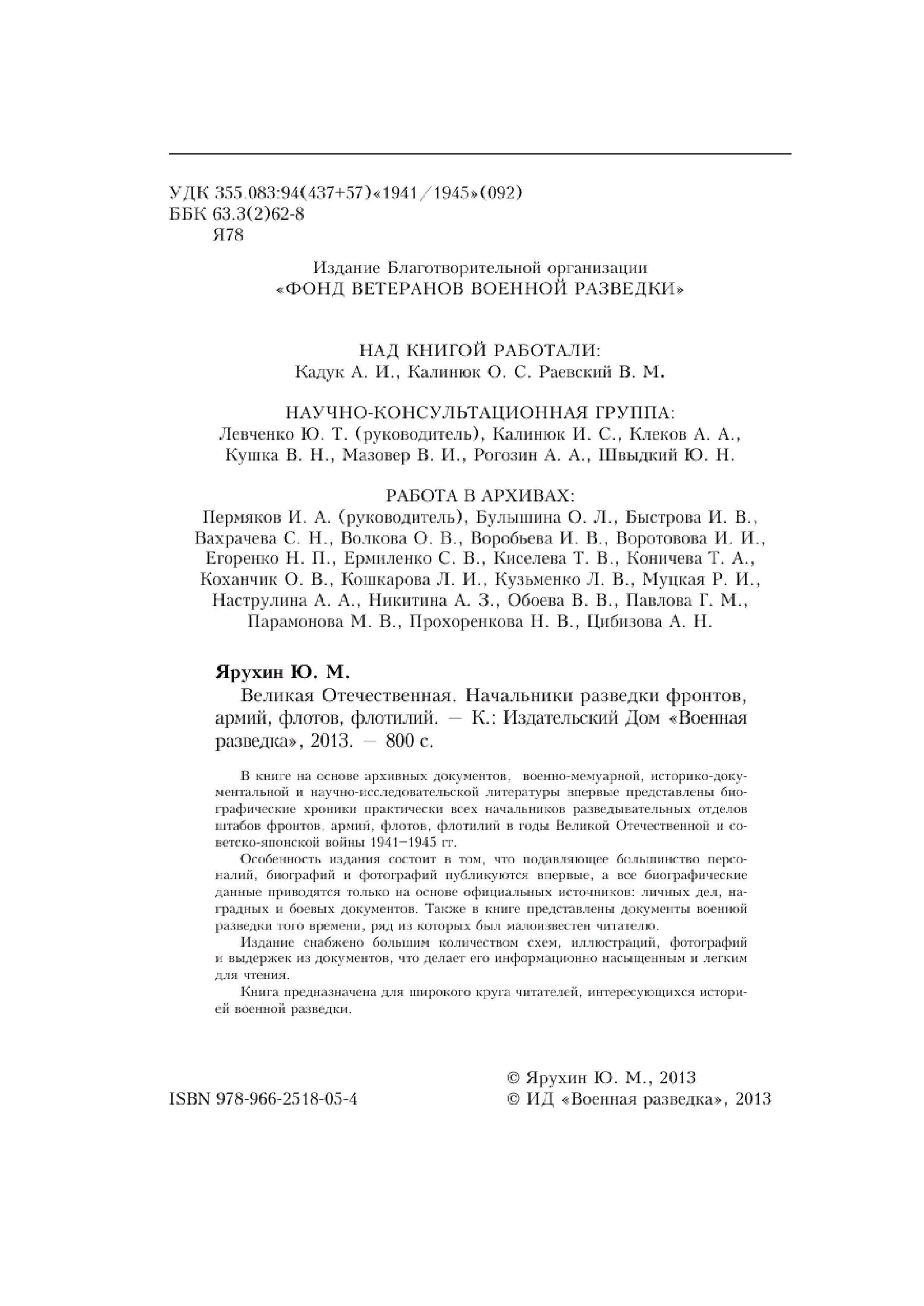 Ярухин Ю. М. Великая Отечественная. Начальники разведки фронтов, армии, флагов, флотилий. — К.: Издательский Дом «Военная разведка», 2013. 800 с.