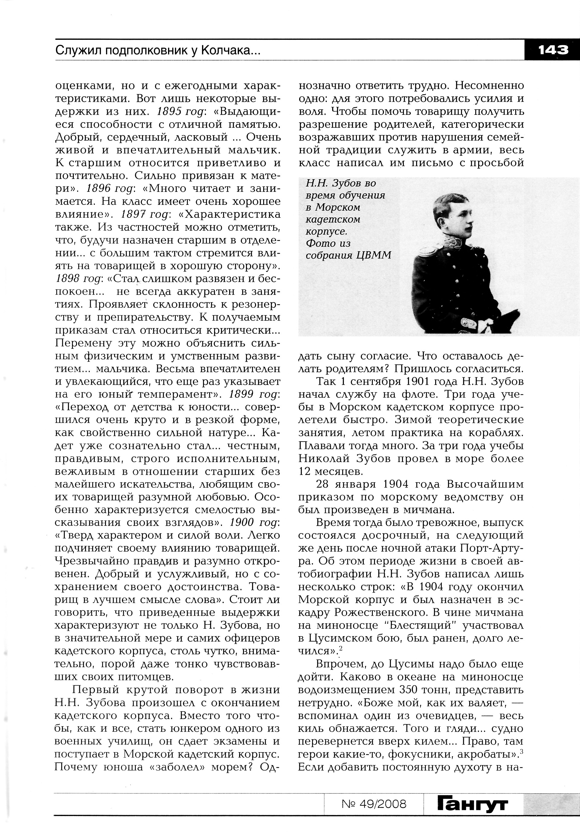 Ротмистр Николай Тимофеевич Зубов, из почетных граждан Херсонской губернии, как свидетельствуют его послужные списки, к 1901 г. получил звание подполковника и стал дворянином. Сын к этому времени закончил курс обучения в кадетском корпусе, и нужно было определить его дальнейшую судьбу. Николай Тимофеевич подал прошение о допуске сына к конкурсным экзаменам в специальные классы Морского кадетского корпуса.