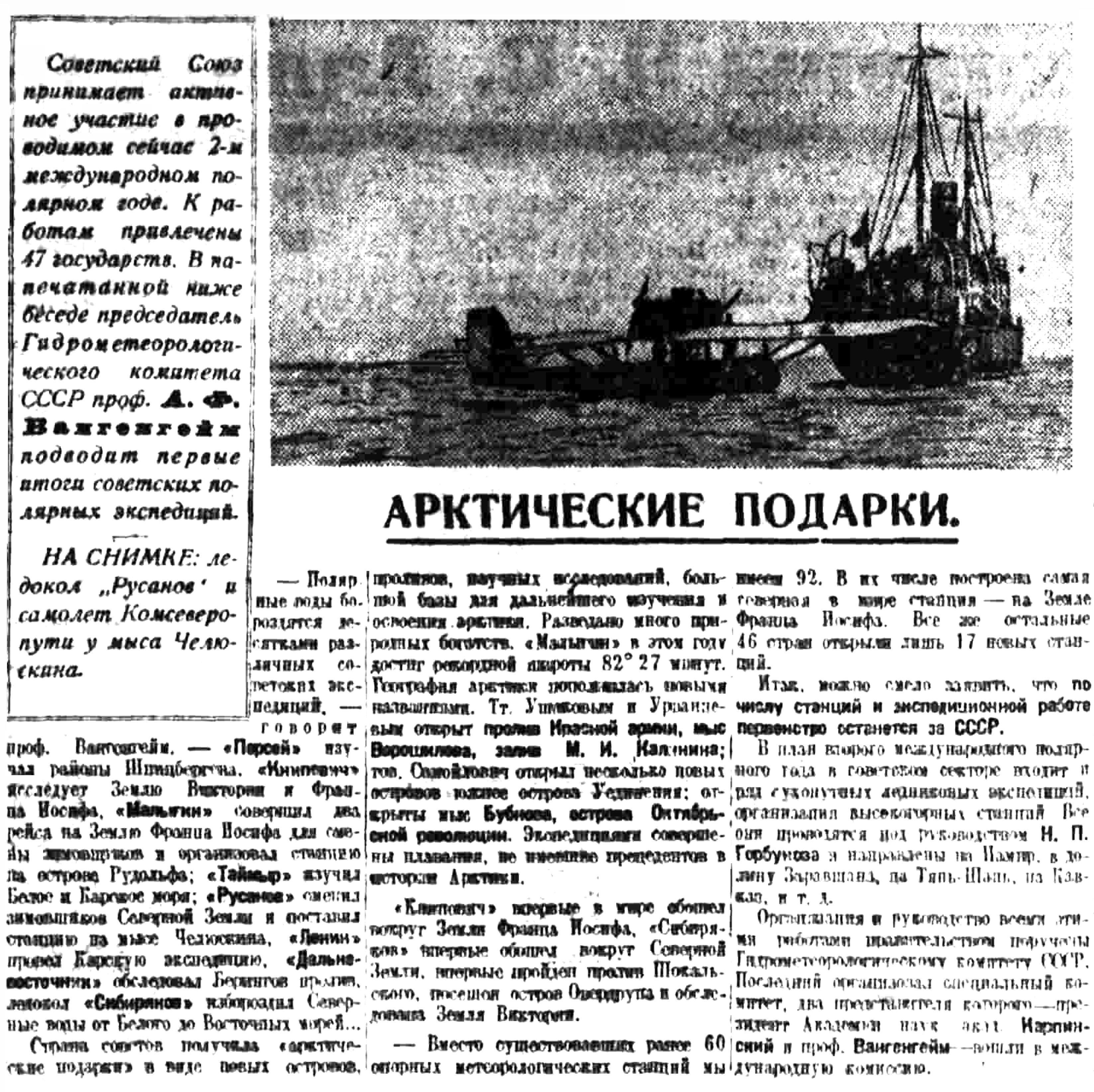 20 мая 1930 г. Совнарком СССР принял решение об участии Советского Союза в проведении Второго Международного полярного года (II МПГ). Руководство работами по подготовке и проведению II МПГ в СССР было возложено на Гидрометеорологический комитет СССР. Советский комитет по проведению II МПГ возглавил А.Ф.Вангенгейм. Алексей Феодосьевич считал, что для СССР вопросы, касающиеся арктического магнетизма, северного сияния, метеорологии, аэрологии и включаемых ими актинометрии, атмосферного электричества, климатологии и пр., теснейшим образом связываются с вопро сами гидрологии. Он доказал необходимость включения их в программу II МПГ, а также и некоторых других. К работе были привлечены представители всех крупнейших научных учреждений страны.