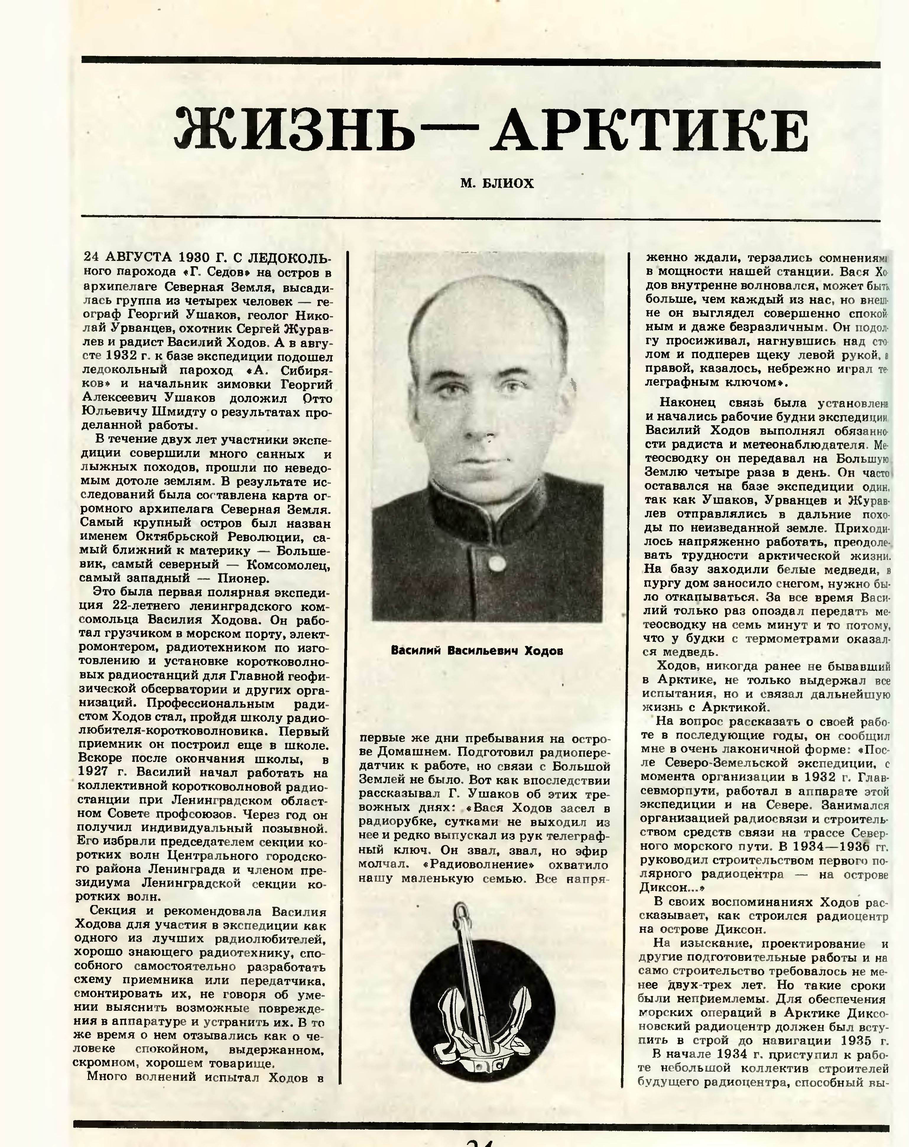 Путевку в Арктику Ходову, как и десяткам других полярников, дало радиолюбительство — общественное движение, возникшее в нашей стране в начале 20-х годов. Имена Э. Т. Кренкеля., Н. Н. Стромилова, В. В. Ходова. Д. П. Аралова, О. А. Куксина и многих других вошли в летопись полярных исследований. Все они начинали свой жизненный путь с радиолюбительства, которое потом питало их своими живительными соками всю жизнь.