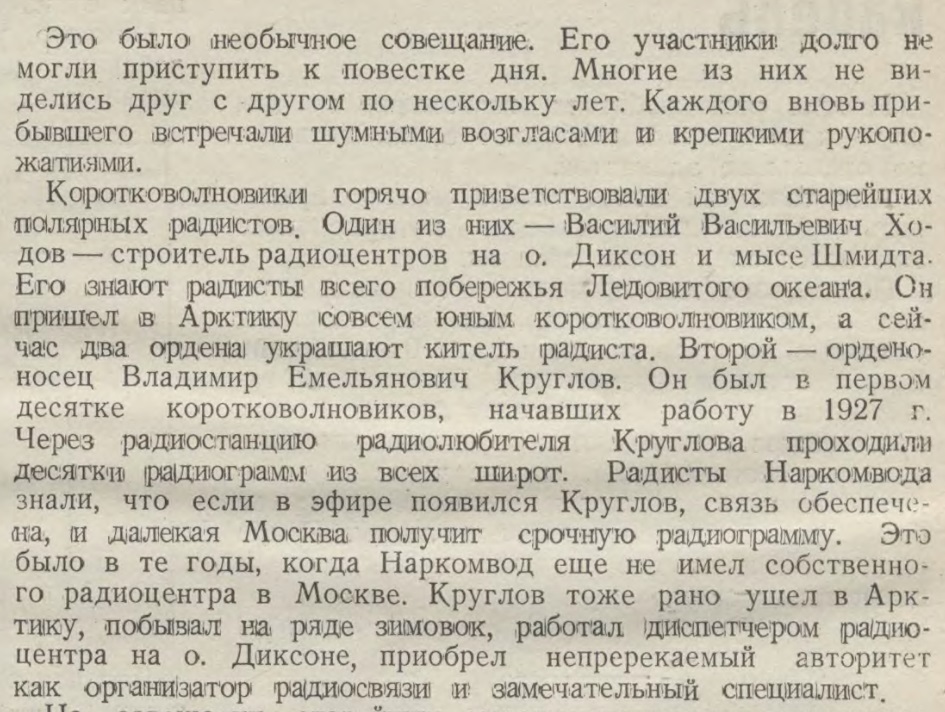 Воробьев [нач.радиослужбы ГУСМП]: … Тов.Светаков несколько «смазывает» роль тов.Ходова. Несмотря на все недостатки, говорить, что тов.Ходов плохой администратор, недостаточно способный и т.п., не следует по следующим соображениям: вся подготовка радиооборудования до отправки на Диксон проходила под его непосредственным рук-вом, подготовка была проведена блестяще, что обеспечило такие хорошие результаты строительства. То же самое и в отношении подбора людей. Подбор производился тов.Ходовым и теперь на качество работников никто не жалуется. А молчаливый характер тов.Ходова поставить ему в вину нельзя…