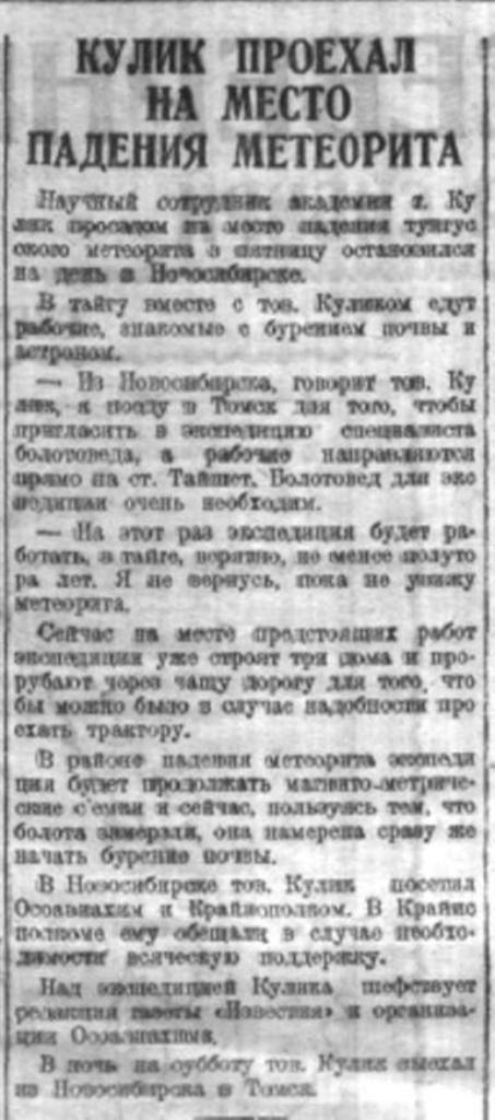 В настоящее время в г. Красноярск прибыл заведывающий метеорным отделом Академии Наук Л. А. Кулик со специальной целью поездки на р. Чуни для розыска метеорита.
