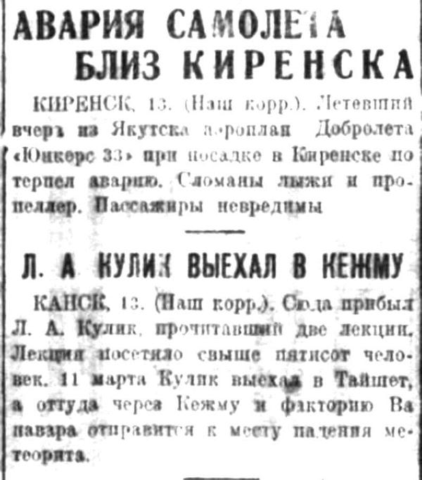 Прибывшим в Иркутск заведующим метеорным отделом Всесоюзной Академии наук Л. А. Куликом 10 и 11 декабря были прочитаны в Госуниверситете и Горном институте лекции о метеоритах вообще и о Тунгусском метеорите, в частности.