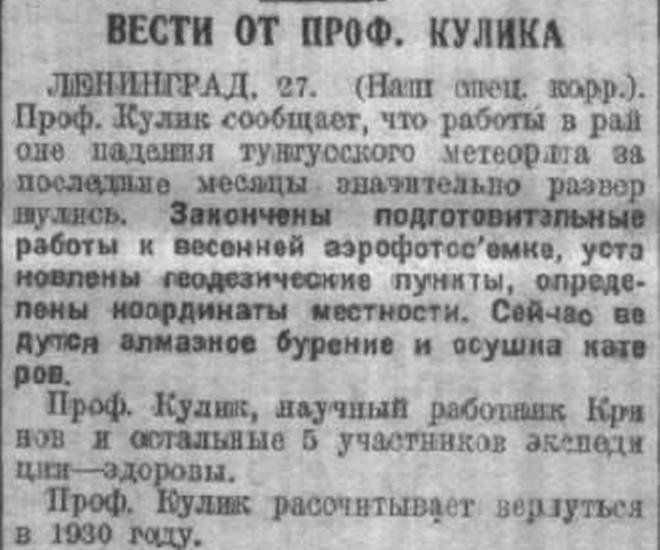 Профессор Кулик, в беседе с корреспондентом РОСТА сообщил: «Сейчас на стоянке метеоритной экспедиции строится изба для рабочих. В январе после моего обратного приезда из Ленинграда, если позволят обстоятельства на месте падения метеорита начнется бурение воронок. Только в случае успешных буровых работ можно будет судить о составе метеорита и о глубине его залегания».