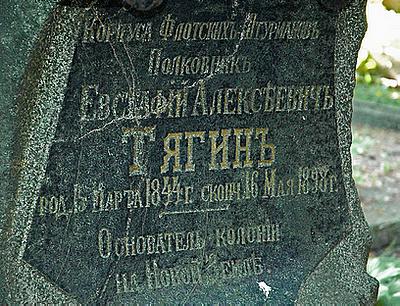 Умер в 1898 году в Лиепае в чине полковника корпуса флотских штурманов и похоронен на морском кладбище. На надгробье надпись: «Корпуса флотских штурманов полковник Евстафий Алексеевич Тягин родился 5 марта 1844 - скончался 1898 г. Основатель колонии на Новой Земле».