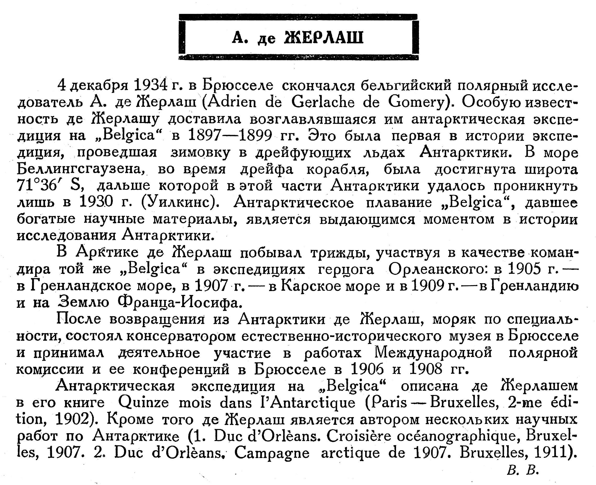 4 декабря 1934 г. в Брюсселе скончался бельгийский полярный исследователь А. де Жерлаш (Adrien de Gerlache de Gomery). Особую известность де Жерлашу доставила возглавлявшаяся им антарктическая экспедиция на „Belgica" в 1897—1899 гг. Это была первая в истории экспедиция, проведшая зимовку в дрейфующих льдах Антарктики. В море Беллингсгаузена, во время дрейфа корабля, была достигнута широта 71°36' S, дальше которой в этой части Антарктики удалось проникнуть лишь в 1930 г. (Уилкинс). Антарктическое плавание „Belgica", давшее богатые научные материалы, является выдающимся моментом в истории исследования Антарктики.