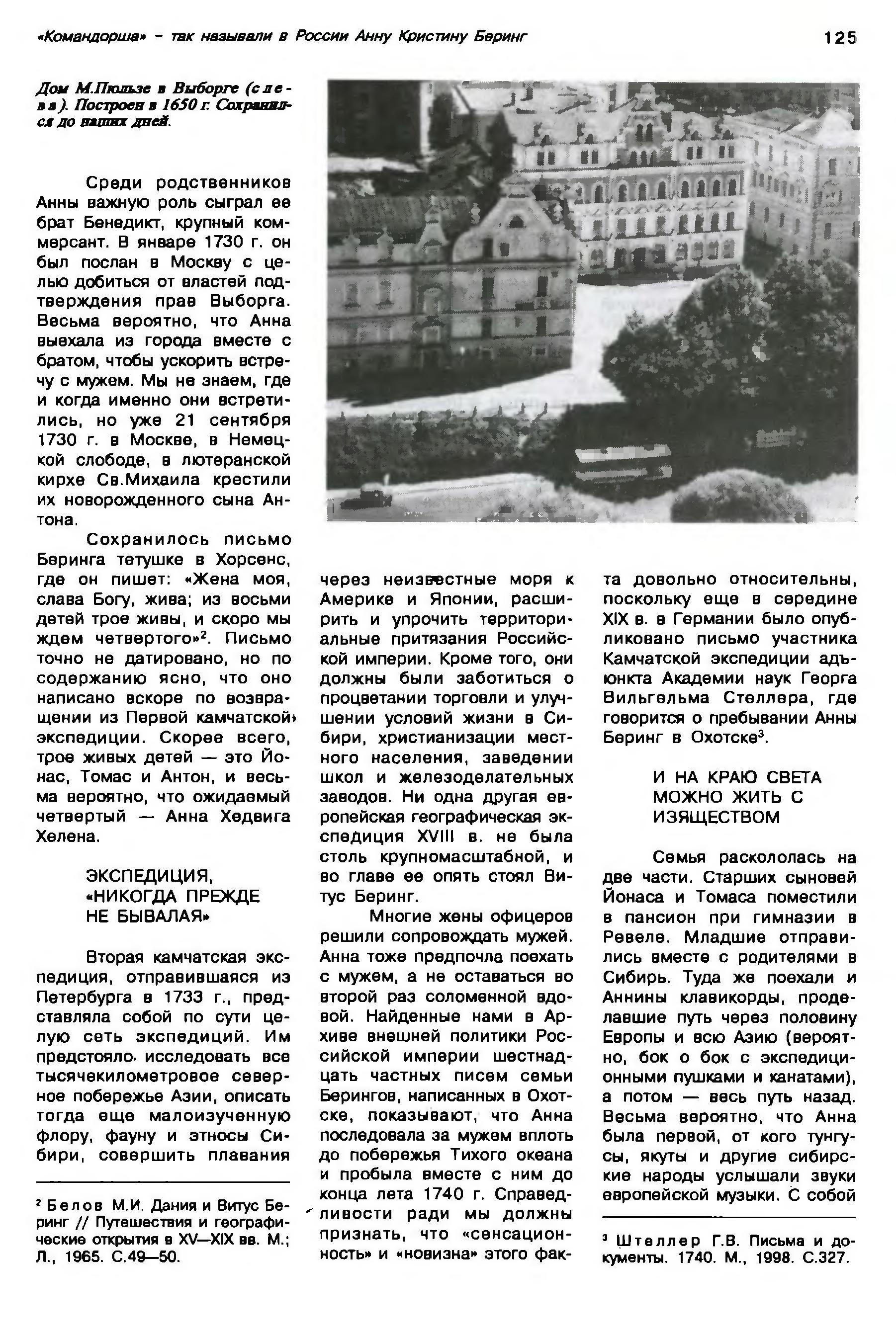 ПОЛОВИНУ населения земного шара составляют женщины, а в исторических сочинениях им отведено гораздо меньше места, чем мужчинам. Причины этого дисбаланса не будем здесь обсуждать, зато отметим, что гораздо сильнее радость историка, когда на фоне «теней прошлого» вдруг вырисовывается изящный женский профиль. Эту радость авторам посчастливилось испытать во время просмотра в русских архивах документов, относящихся к двум Камчатским экспедициям второй четверти XVIII в., которые возглавил датчанин по рождению Витус Беринг. Через строчки многочисленных сухих указов и рапортов, отражающих сугубо мужской мир моряков и путешественников, начал все четче проступать образ женщины — преданной спутницы Беринга как по жизни, так и по — в самом прямом значении этого слова — Второй камчатской экспедиции.