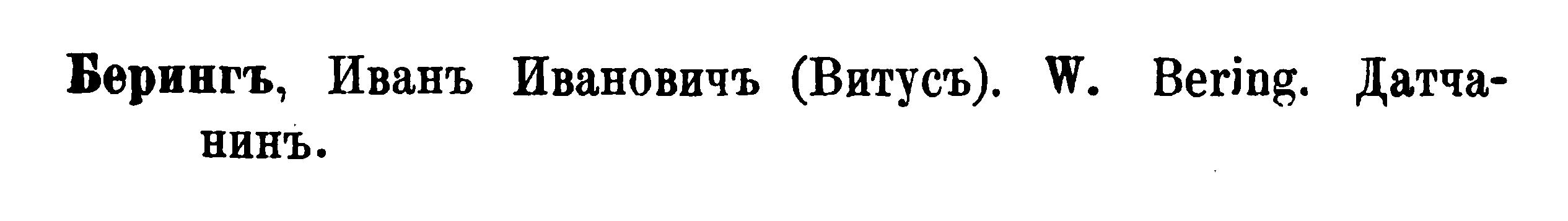 (или Иван Иванович, как его звали на Руси) — капитан-командор, первый русский мореплаватель, именем которого названы пролив, отделяющий Азию от Америки (хотя первый посетил его в 1648 г. казак Дежнев). Первый исследовал сев. берега Камчатки, вост. часть Азии, о. Св. Лаврентия, о. Св. Диомида; первый из всех европейских мореплавателей посетил моря Камчатское и Бобровское, названное впоследствии Беринговым, и открыл цепь о-вов Алеутских, о-ва Шумагинские, Туманные, сев.-западную часть Америки и бухту Св. Илии. — Б. родился в 1680 г. в Ютландии, в русскую морскую службу вступил в 1704 г., с чином унтер-лейтенанта. Приглашая его, Петр основывался на представлениях о нем Сиверса и Сенявина, заявлявших, что он "в Ост-Индии был и обхождение знает". По свидетельству Миллера, в 1707 г. Б. был лейтенантом, а в 1710 г. — капитан-лейтенантом. Неизвестно только, в каких морях он плавал в это время и сам ли командовал судами или находился под командой. 1714—16 гг. Б. провел все почти время на море, побывал и в Копенгагене, и в Архангельске. С 1716 г. по 1723 сведений о жизни Б. нет. Под 1723 г. в журналах адмиралтейств-коллегии находится постановление об отставке Б., которую он просил, не добившись желаемого им чина капитана первого ранга. Но в следующем году император отдает приказание коллегии пригласить снова на службу Б. и дать ему чин капитана 1-го ранга. С этого (1724) года Б. неизменно служил русскому флоту до самой смерти и всю свою деятельность посвятил решению вопроса, поставленного ему великим преобразователем: "соединяется или нет Азия с Америкой". С этим вопросом и просьбой снарядить экспедицию впервые обратились к Петру голландские ученые во время его пребывания в Голландии, в 1717 г. ту же просьбу к Петру повторила и Парижская академия наук. Отзывчивый преобразователь сочувственно отнесся к их просьбе, но политические события заставили его отложить выполнение этого дела до 1725 года. 23 декабря 1724 г. он собственноручно написал следующую инструкцию для начальника экспедиции Витуса Беринга: 1) надлежит на Камчатке или в другом там месте сделать один или два бота с палубами, 2) на оных ботах возле земли, которая идет на Норд и по чаянию (понеже оной конца не знают), кажется та земля часть Америка, 3) для того искать, где оная сошлась с Америкой: и чтоб доехать до какого города европейских владений или ежели увидят какой корабль европейской проведать от него, как оный кусть называют и взять на письме и самим побывать на берегу и взять подлинную ведомость и поставя на карту приезжать сюды".