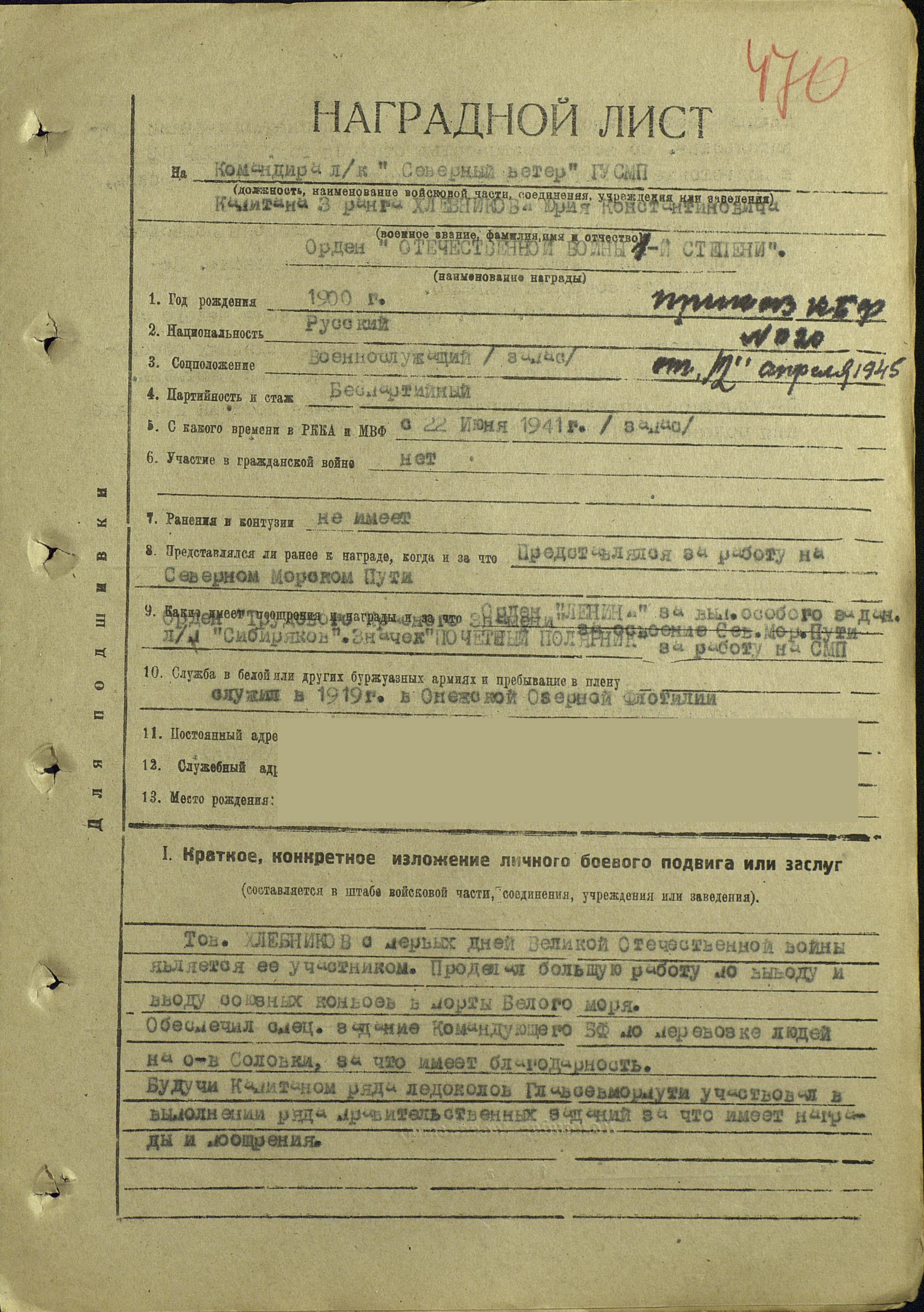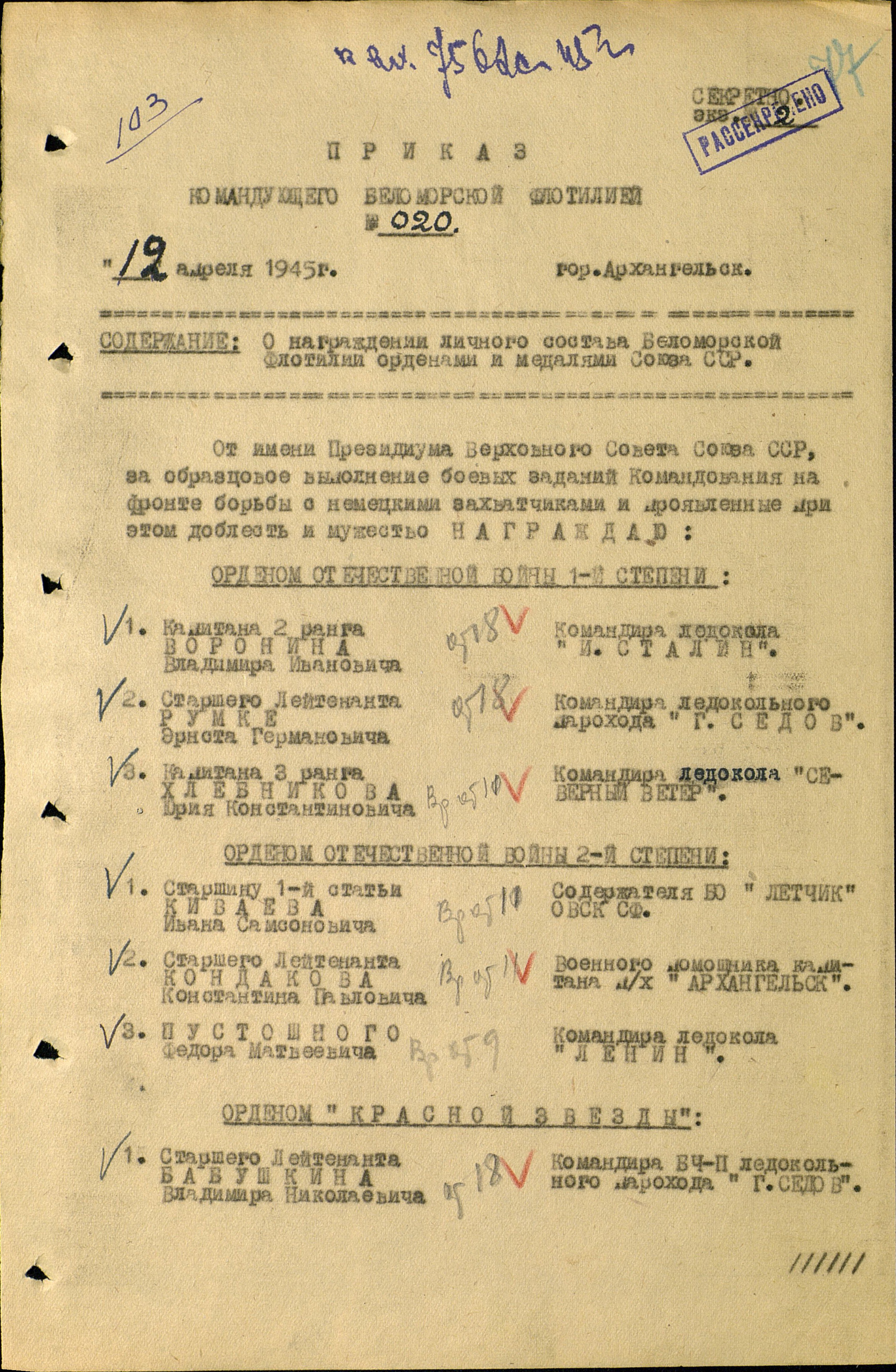 В 1944 году за выполнение особого задания он был награжден орденом Отечественной войны 1 степени, а в 1945 году за конвойную службу – орденом Нахимова 2 степени.
