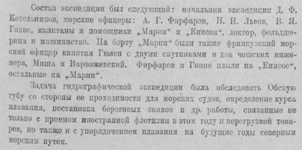 Состав экспедиции был следующий: начальник экспедиции Д. Ф Котельников, морские офицеры: А. Г. Фирфаров, Н. Н. Львов, В. Я. Гоппе, капитаны и помощники „Марии" и "Енисея", доктор, фельдшерица и машинистка. На борту „Марии" были также французский морской офицер капитан Гюлен с двумя спутниками и два чешских инженера, Миша и Варвожевский. Фирфаров и Гоппе плыли на „Енисее", остальные на „Марии".