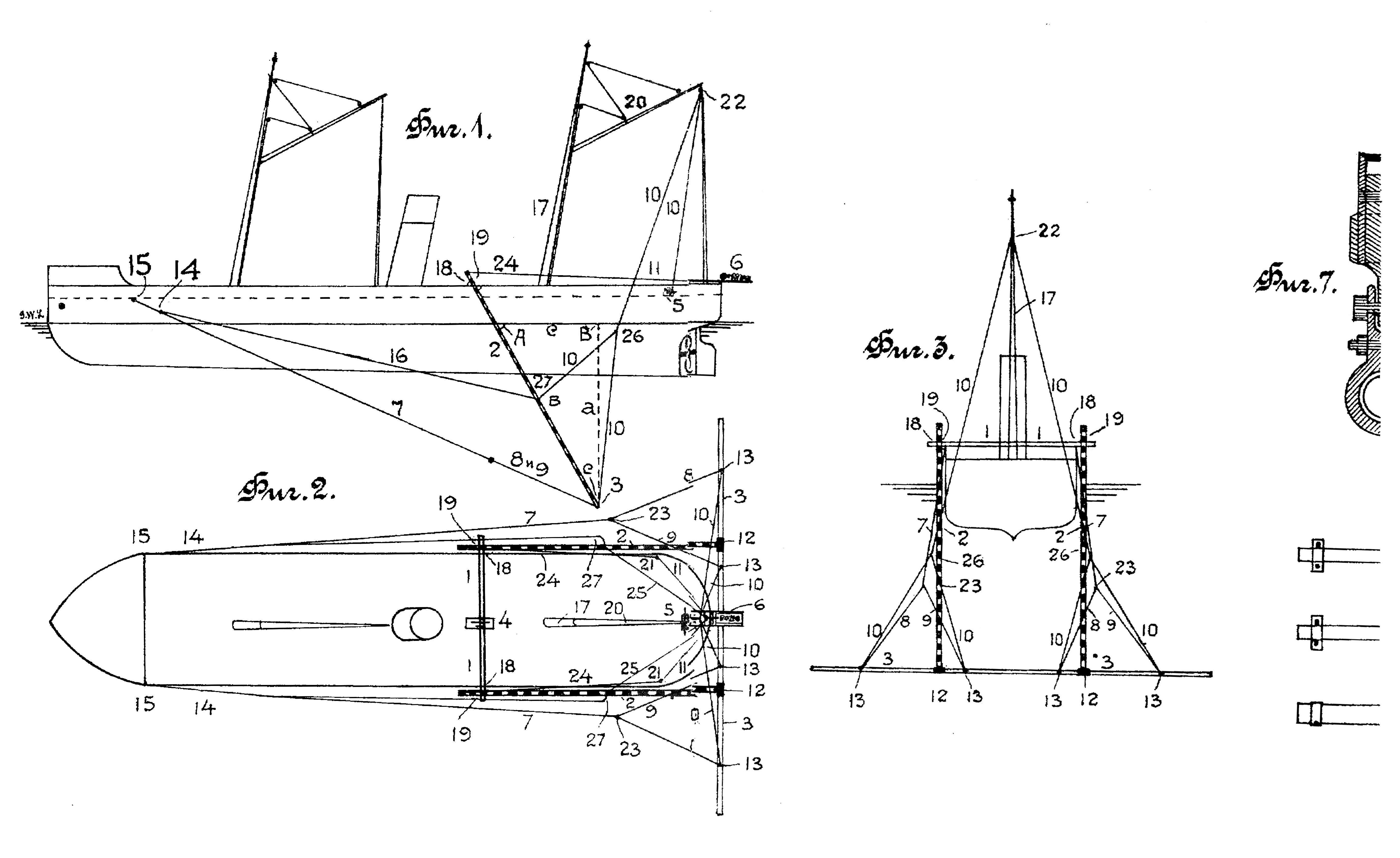 Два кожаных браса 7, 8 и 9 (фиг. 2) закладываются раздвоенными концами 8 и 9, снабженными храпцами, в отверстия обушков, одетых на основную трубку трала 3, как показано на фиг. 2 и 3 и, соединившись потом в один | в точке 23, проходят на бак, где в них ввязывается разгибающийся крючек (фиг. 1 и 2), которым они заклады-